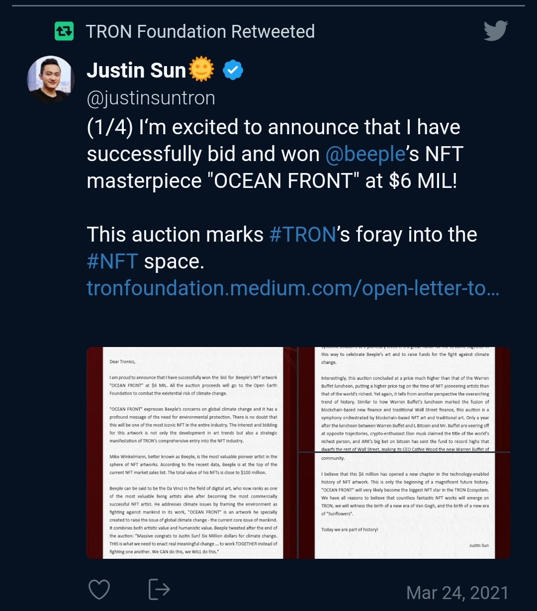 3월 16일 첫 트윗으로 운을 띄웠고, 3월 24일 오션 프론트라는 작품을 6백만 달러에 경매에 성공했다는 내용 이후로도 자주 언급하는 것을 알 수 있습니다. 이 뉴스로 저스트 코인과 트론 코인의 상승 모멘텀을 가져다 주었습니다. 지금은 앞만 보고 달리는 상황이라 가능한 일이라 생각이 듭니다.