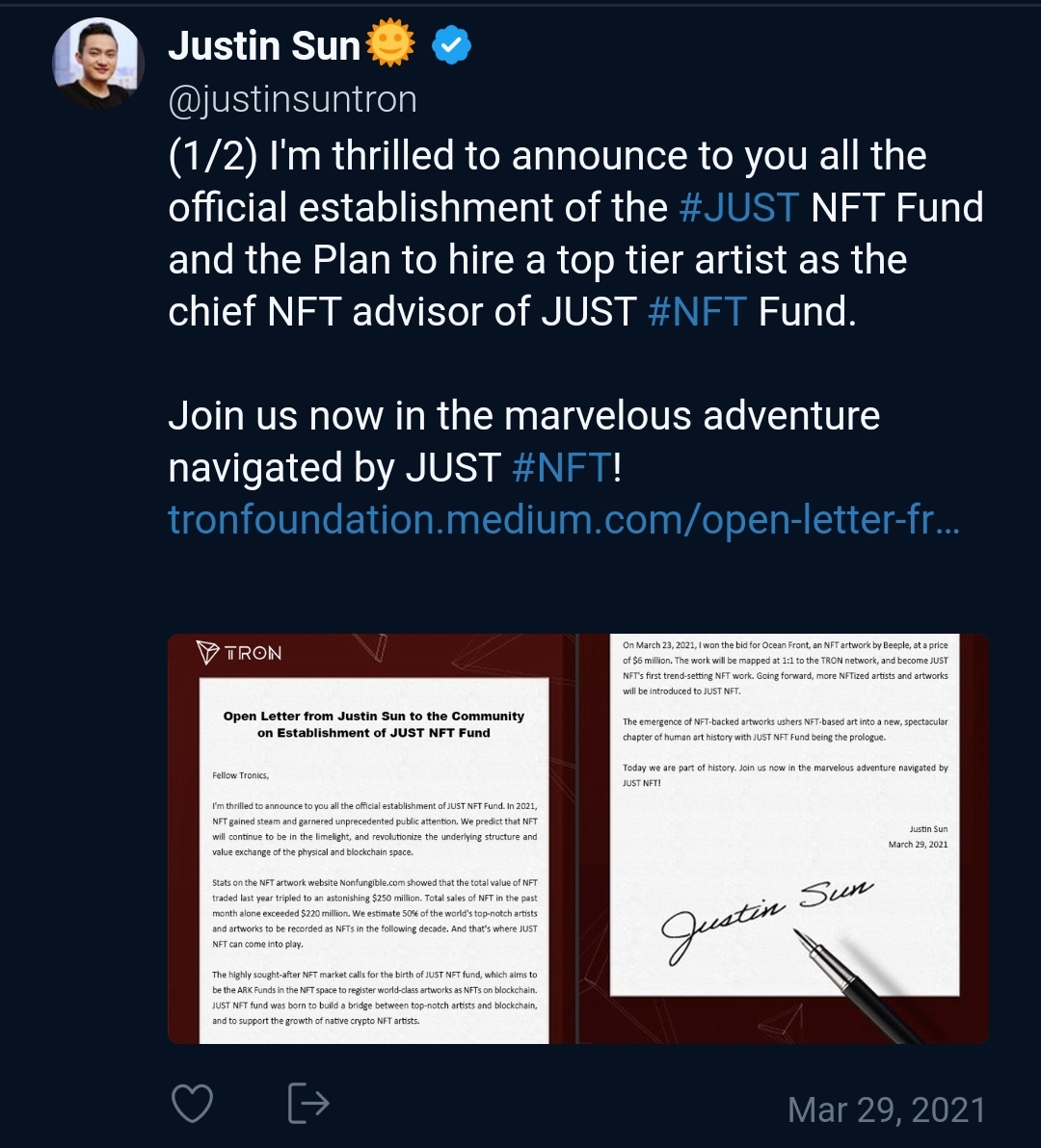 지금의 코인 시장은 어느 코인이든 오르기위한 이유를 찾는 시장이라 생각합니다. 트론 코인 또한 최근 큰 변화가 있는 것은 아닙니다. 트론 생태계에서 저스트 코인(JST)이 디지털 그림을 NFT 형태로 거래가 가능하고 경매로 낙찰되었다는 뉴스가 그 이유를 만들었다고 보고있습니다. 트론의 대표인 저스틴 선이 트윗에서 계속 암시하였고, 그 이유를 만들었다고 봐도 과언이 아닙니다.