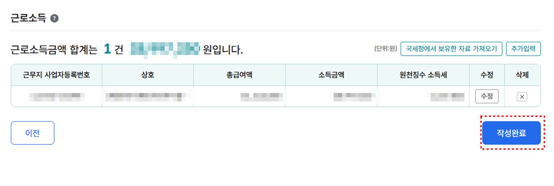 기납부세액은 자동으로 입력되어 있는지 확인 후 ‘작성완료’ 하면 됩니다.