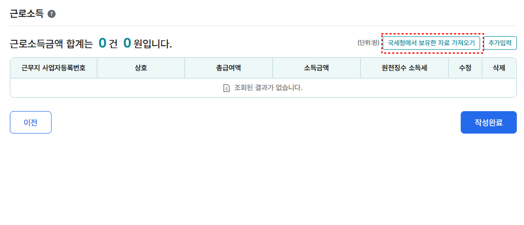 - ‘국세청 자료 가져오기’ 클릭