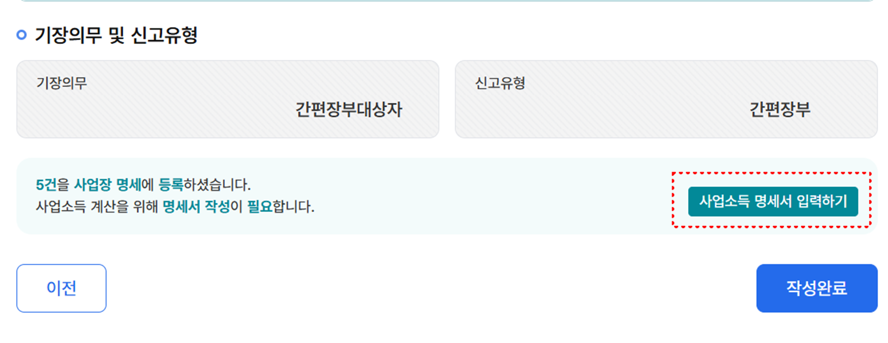 - 단순경비율 대상자는 자동 입력되는 항목 확인만 하면 OK