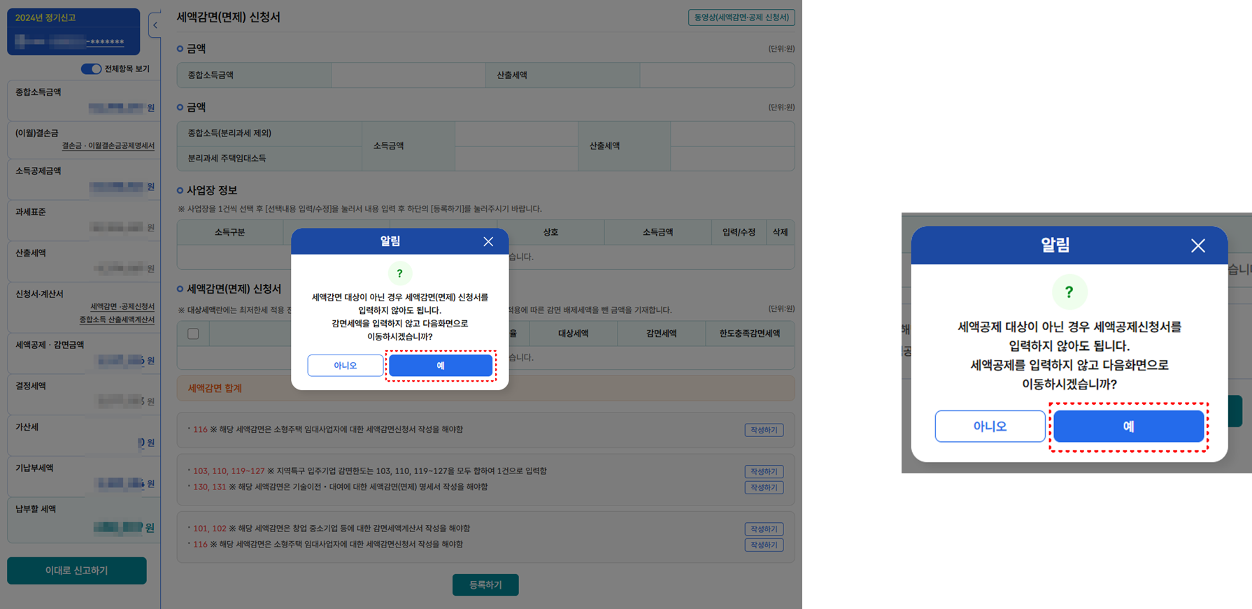 해당 사항이 없으면 ‘예’를 클릭하여 넘어가고,