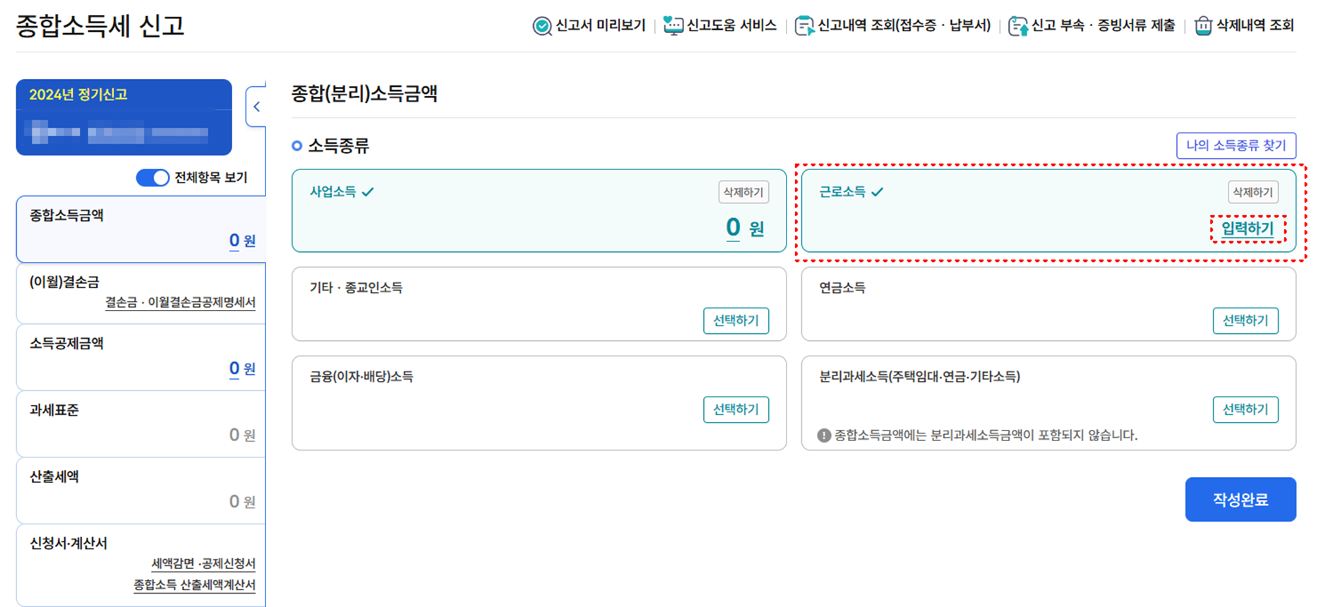 3단계: 근로소득 입력