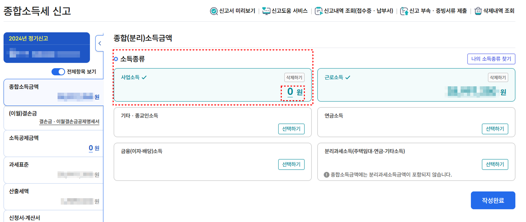 프리랜서, 유튜버, 블로거, 쇼핑몰 운영자 등은 사업소득 항목을 직접 입력해야 합니다.