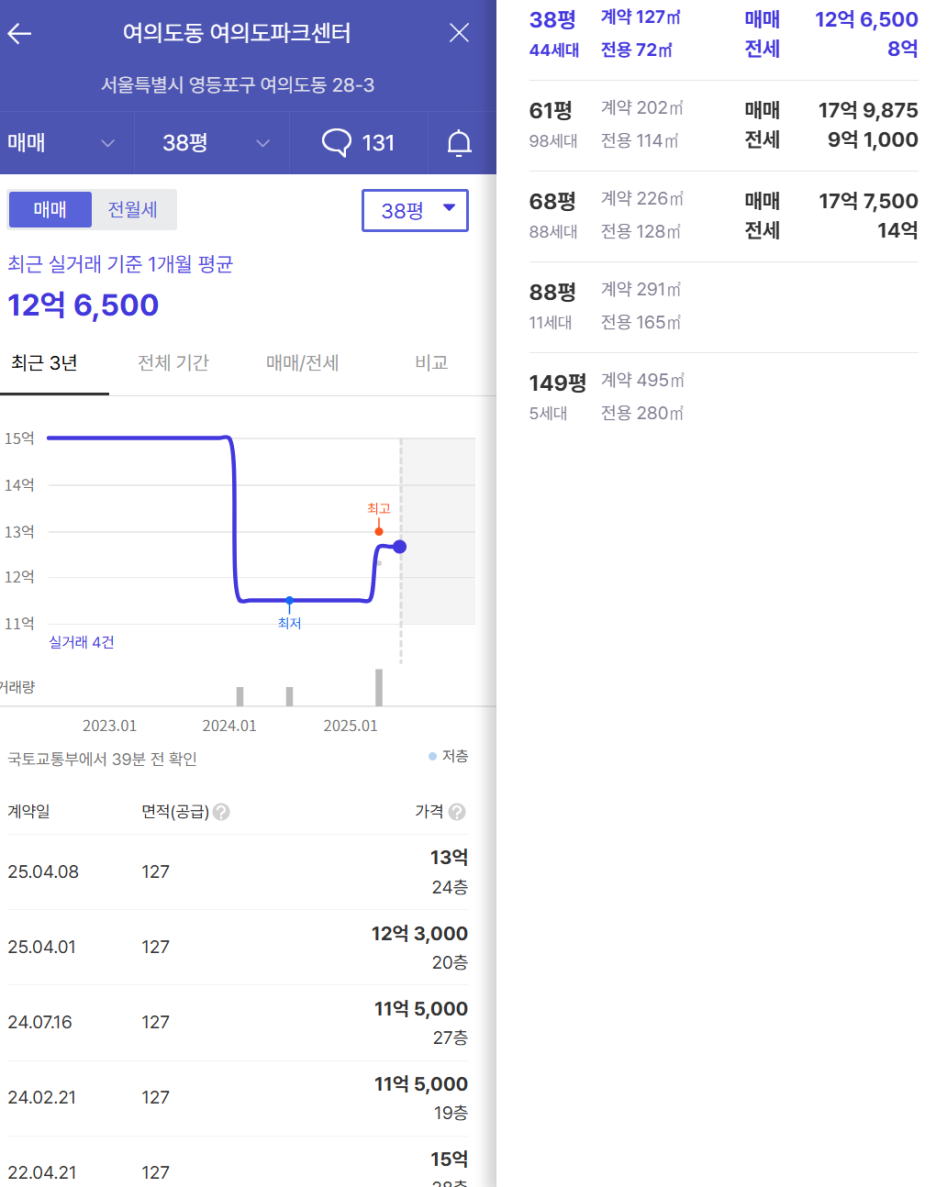 이번 글에서는 여의도 핵심 지역에 위치한 주요 아파텔(주거용 오피스텔)의 시세와 특징을 정리해 보았습니다. 비교의 기준은 아파트 전용면적 59㎡, 즉 약 25평으로 삼았으며, 이에 준하는 오피스텔 면적(전용 84㎡ 기준)으로 분석했습니다.