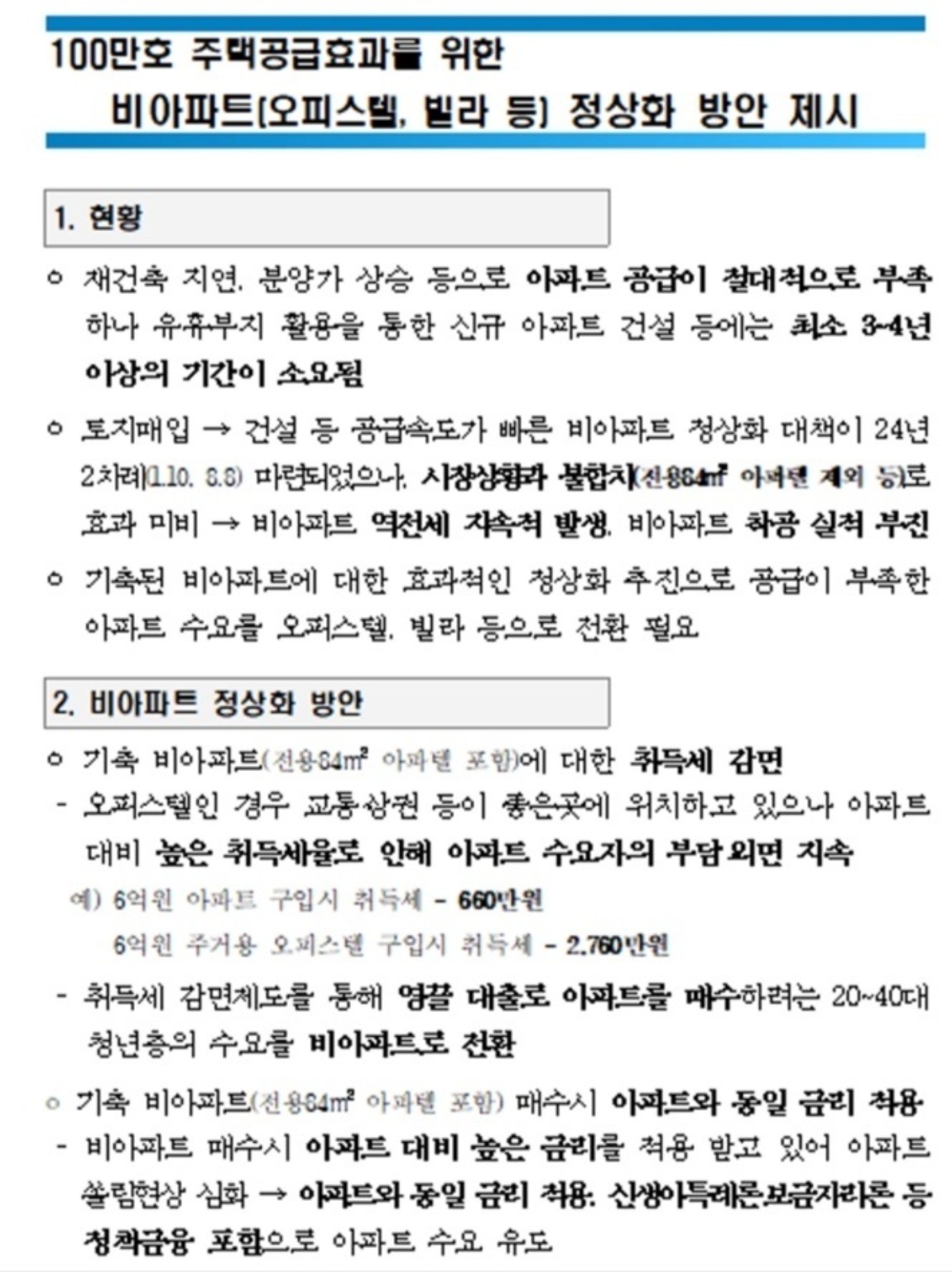 최근 부동산 커뮤니티와 SNS에는 흥미로운 자료가 돌고 있습니다. 정부가 “100만호 주택공급효과를 위한 비아파트(오피스텔, 빌라 등) 정상화 방안”을 준비 중이라는 소문과 함께 한 장의 문서 이미지가 퍼지고 있죠.