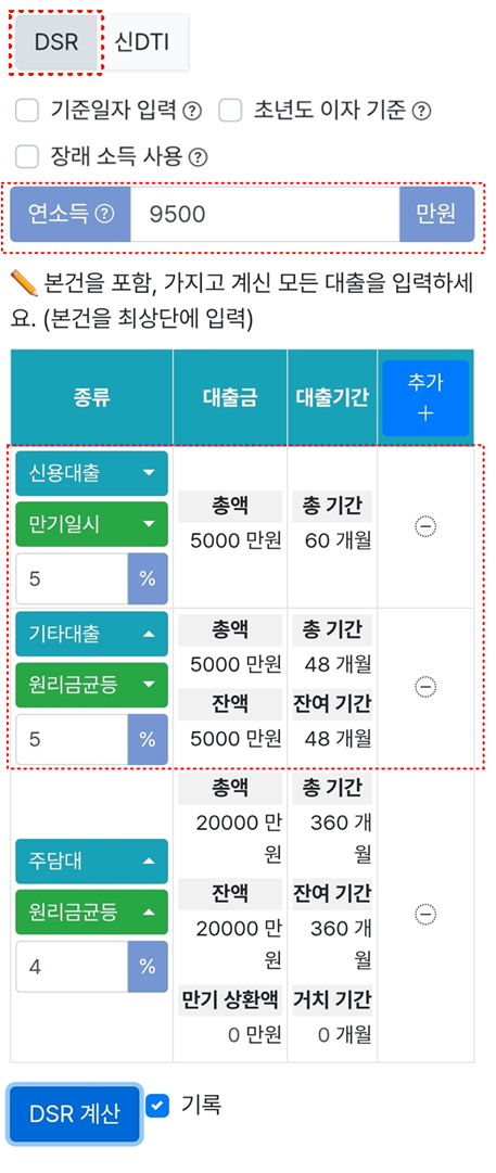 대출 종류·잔액·기간을 입력하면 DSR 계산을 누르면 즉시 계산됩니다.
