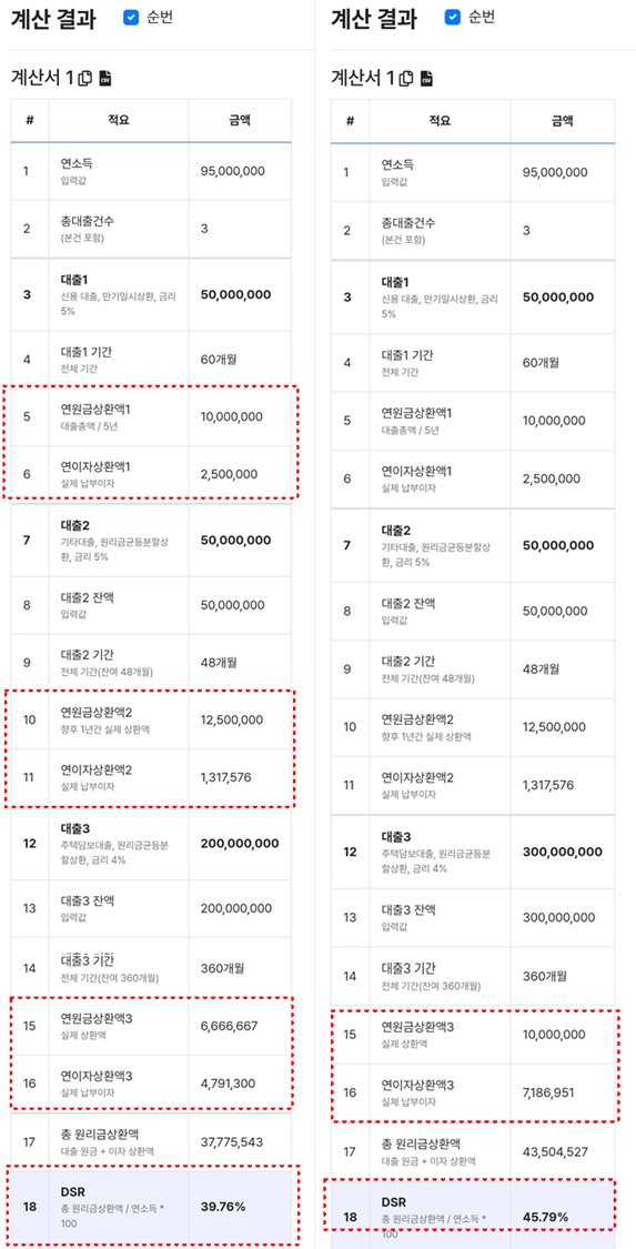 대출 기간이 길수록 DSR이 낮아져 대출 한도가 늘어납니다. 나머지 조건은 같고 주담대를 2억과 3억으로 넣고 비교해봤습니다.