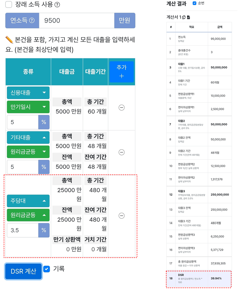 예시: 지방은행 40년 만기·3.5% 금리 적용 시 2.5억원 대출 → DSR 39.94% (1금융권 가능)