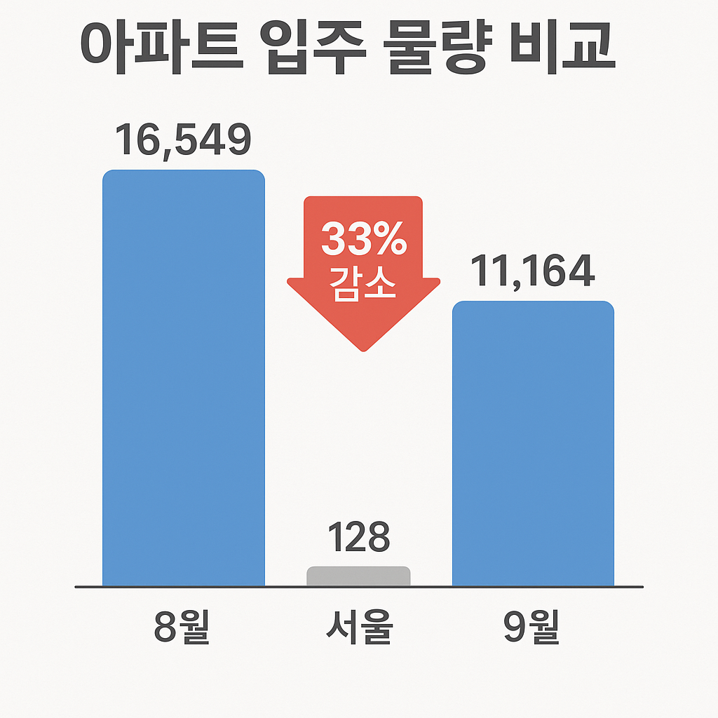자세한 내용은 아래 기사 링크에서 확인하실 수 있습니다.9월 아파트 입주 1만 1134가구, 전월대비 33% 감소…서울 128가구